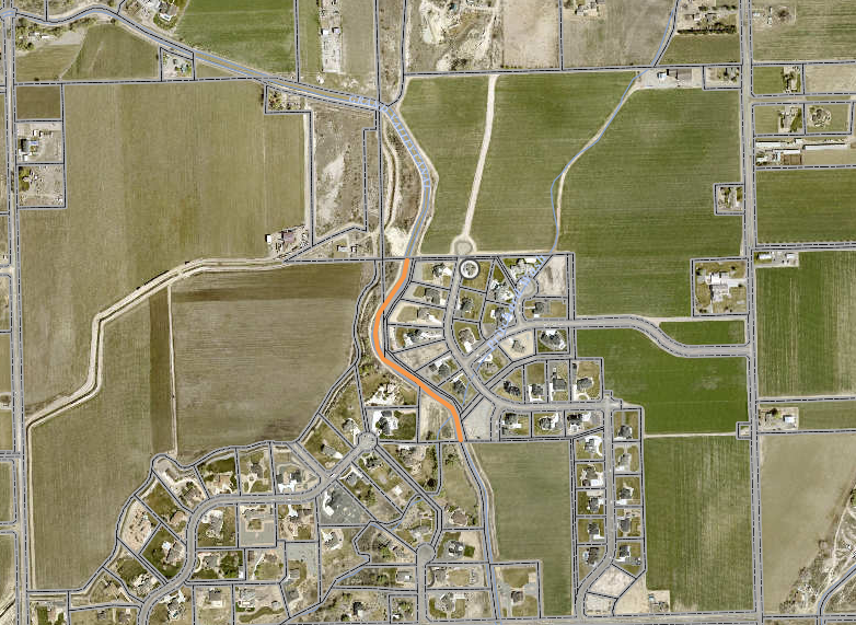 An aerial view of the Smith Estates canal section, with the extent of the project shown in orange.